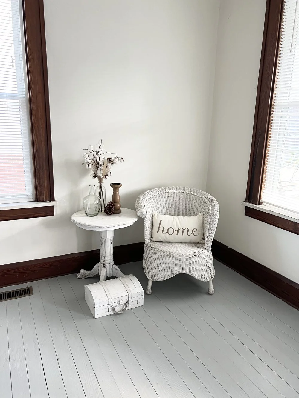 What we adore about this space: The vintage white kitchen cabinets are sturdy and have brass pulls. Plus the natural sunlight throughout is amazing!! The traditional layout is super easy to decorate and keep clean.